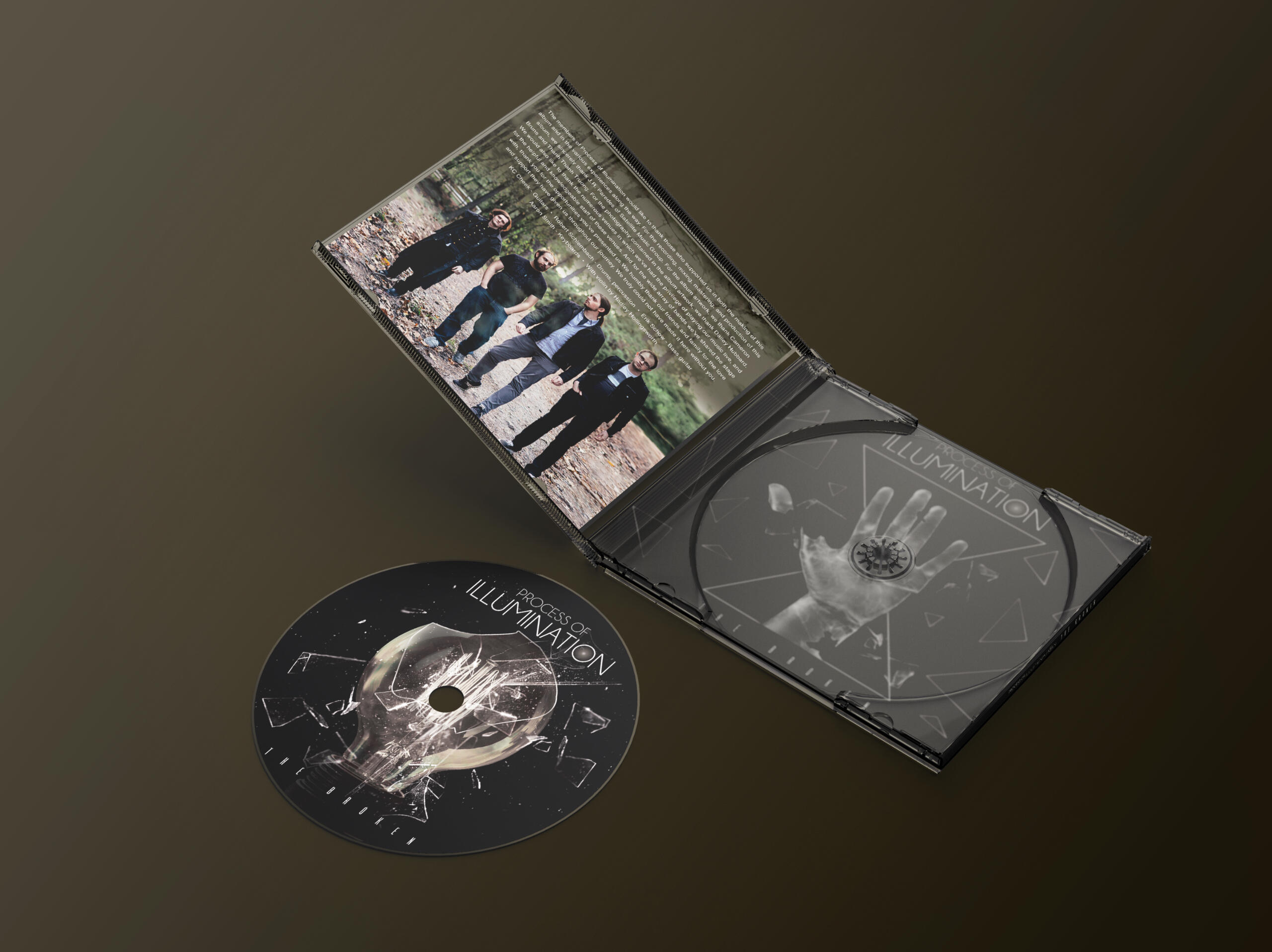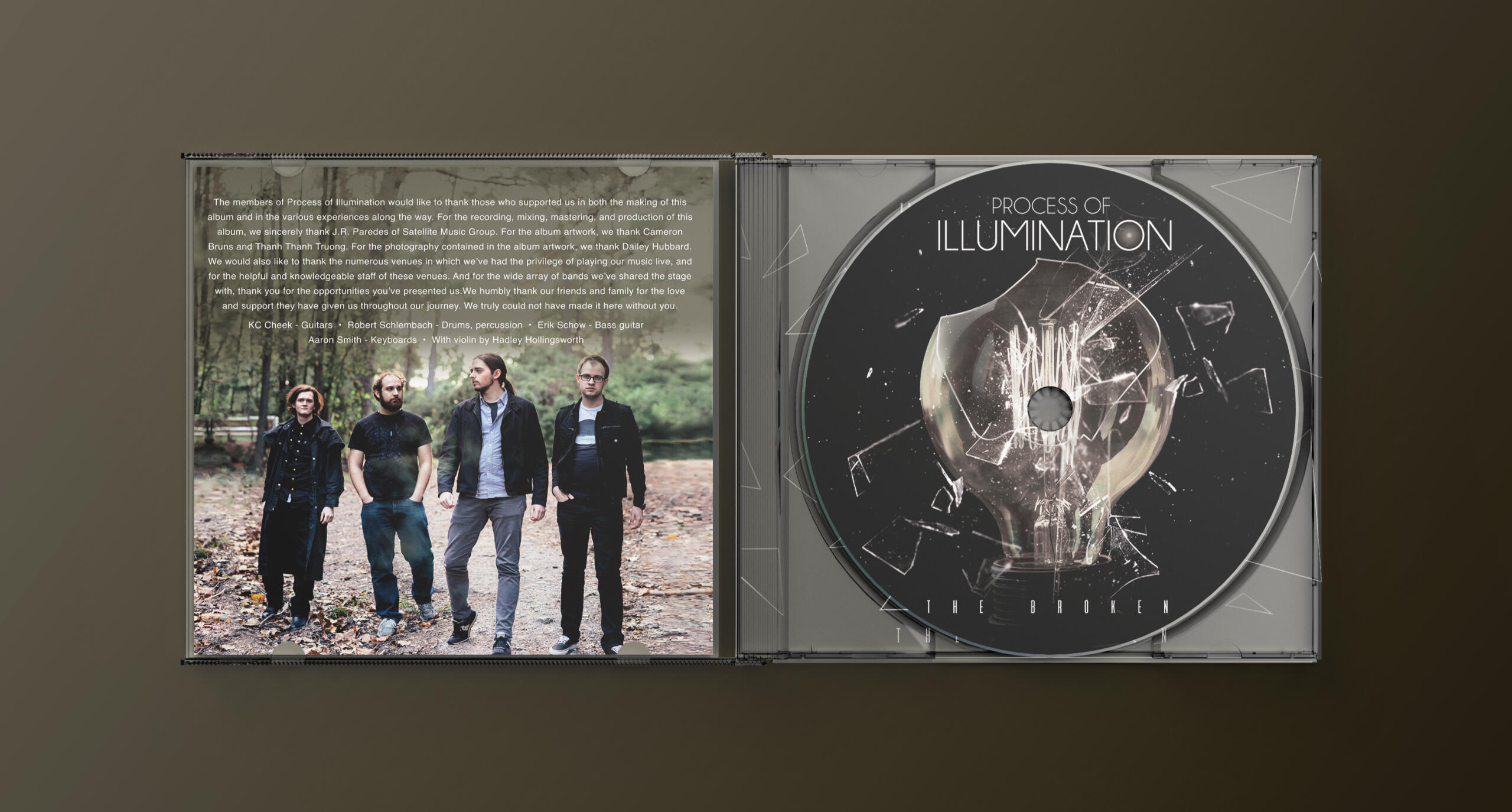 The Broken is the second album I've worked on with the band. Due to the nature of their music's progressive narrative that constantly self-reflects and self-references, we had to create designs that match that as well. In the previous album, they had a photoshoot image where the band members had their hands reaching out a shared goal and dream in the form of a lightbulb.With this sophomore album, the brief was to play off of that image and demonstrating the fragility of those elements. By ways of photo manipulation, I was able to turn an image of a hand reaching up into a fragmented glass hand stuck between a geometric hour glass.With the disc art, I took a lightbulb stock image and turned it into a self-imploding, mid-action light. The goal was to contrast the stillness of the hand with the dynamic lightbulb in composition and in monochome vs. color.
