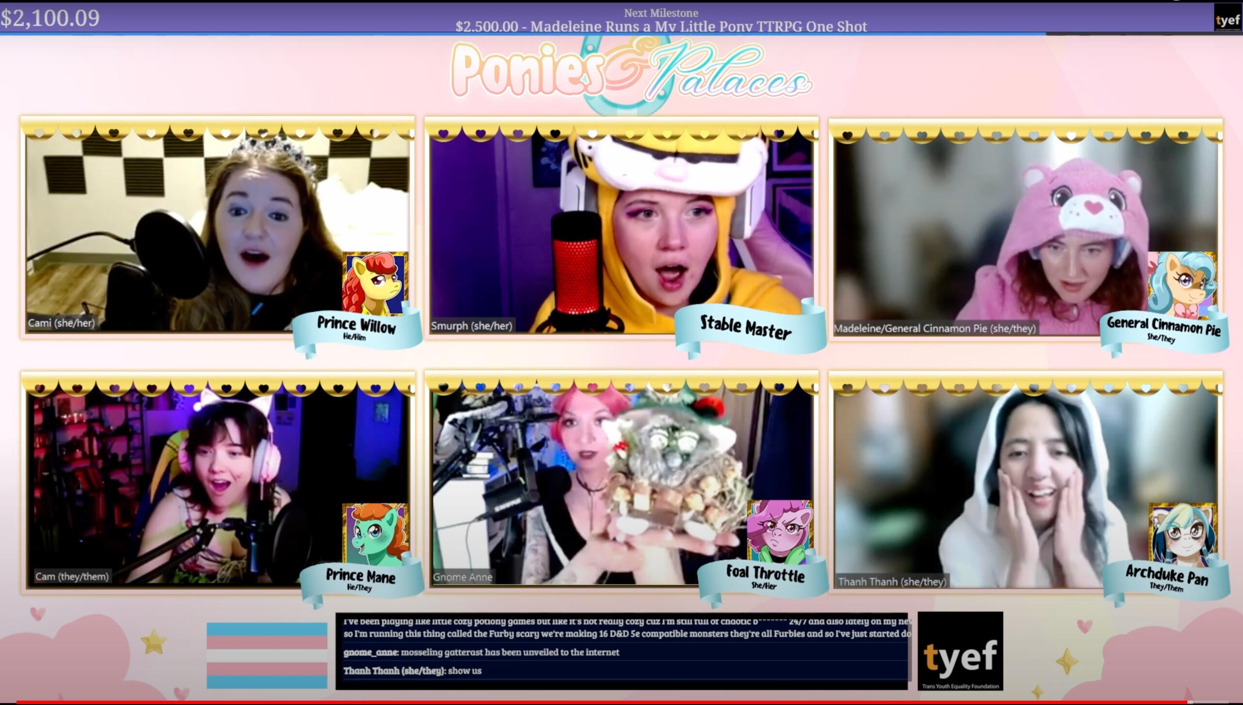 In Feb 2023, Twitch streamer and performer OopsallSmurph hosted a charity game for the Trans Youth Equality Foundation. For our ninth collaboration, we decided to dive into the magical and mystical world of ponies. This game was held after some devastating bills were passed. The cause held a special place in my heart. I not only drew on all of the magical girl inspiration rooted in my nostalgia, but I also joined the performing cast.